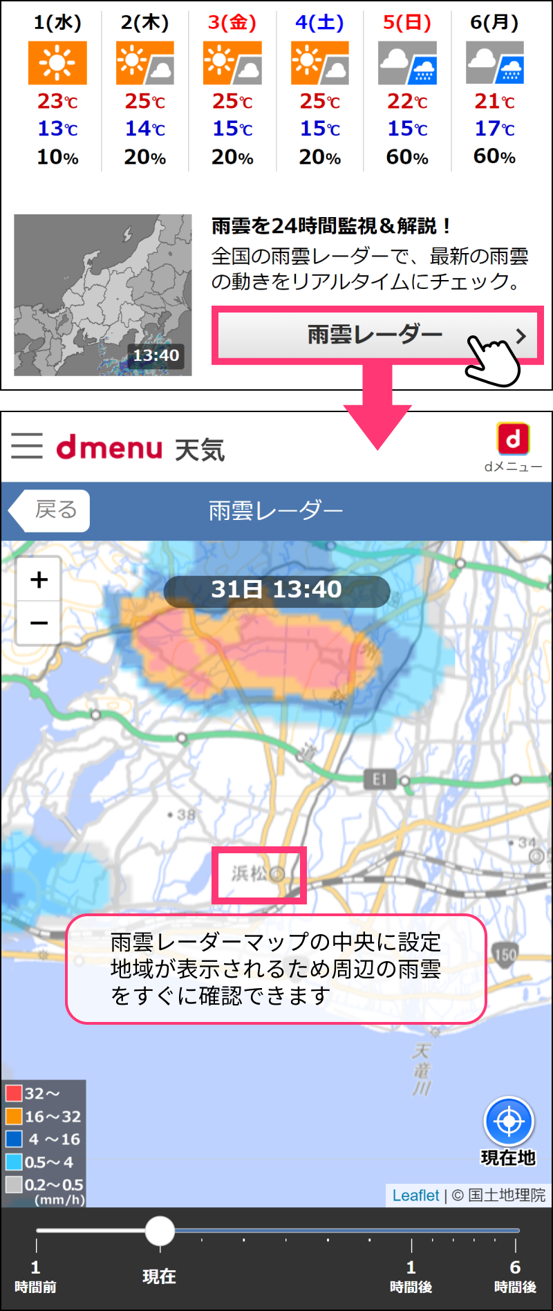 雨の降る可能性がある場合は、今日・明日の天気の下にもリンクが表示され、同じように見ることができます。