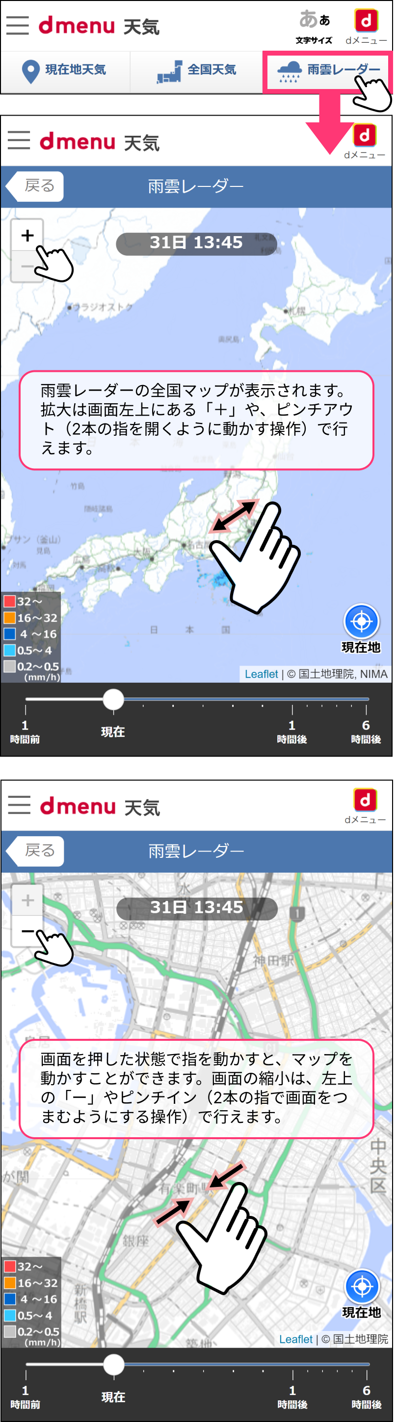 マップの拡大・縮小・移動は自在です。自由に操作して気になるエリアの雨雲をご確認ください。